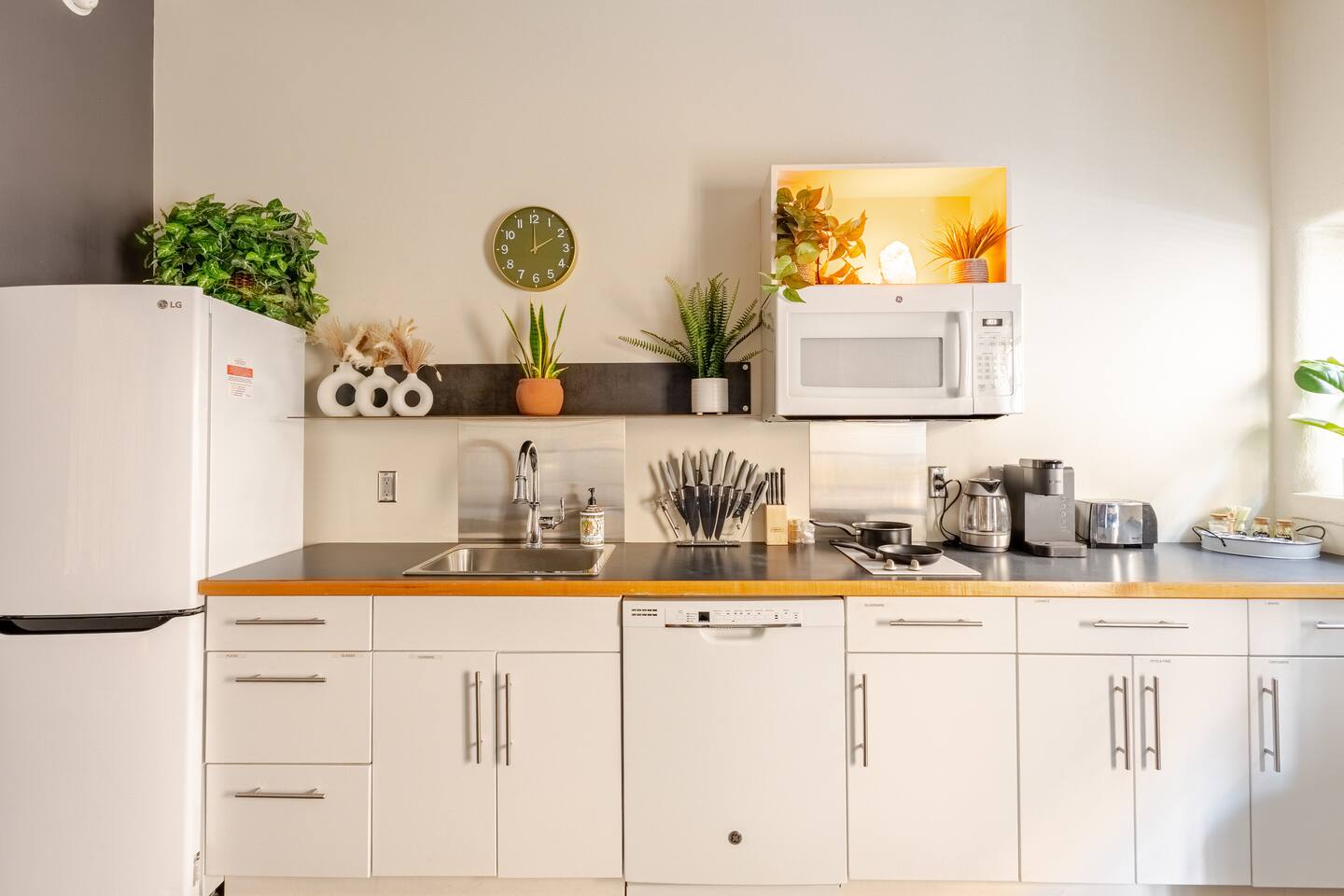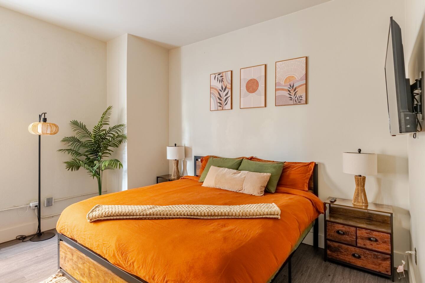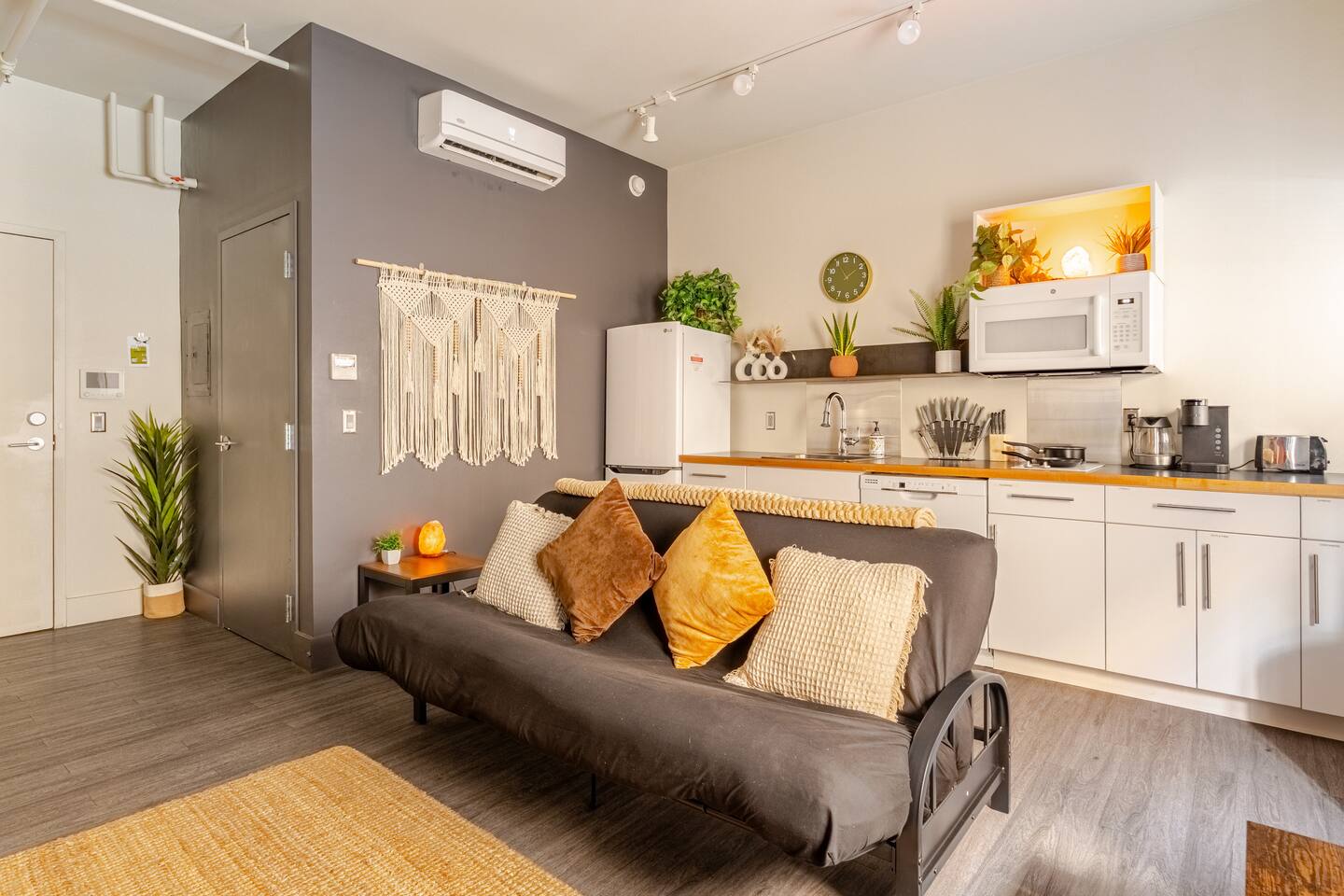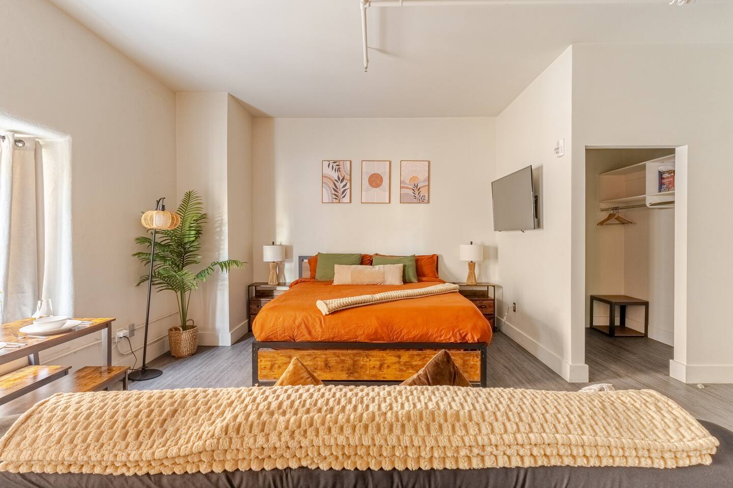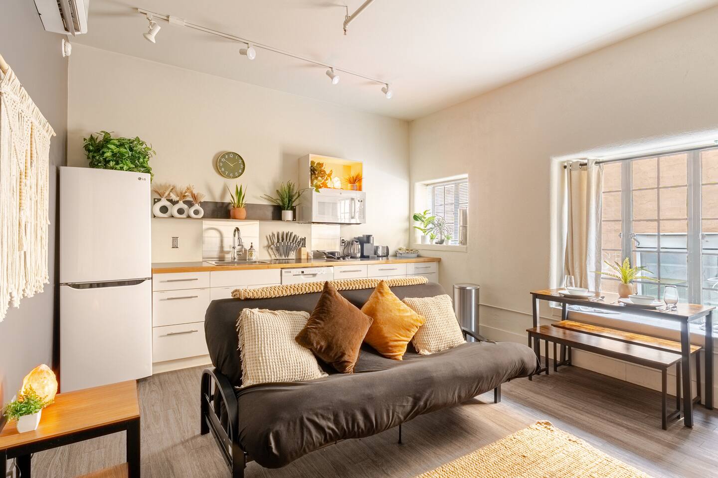 Start your Tucson adventure in a modern desert-boho retreat where design meets comfort. Natural light fills the space, highlighting warm textures, greenery, and curated details that make every moment feel intentional. Whether you’re here for a weekend getaway, a campus visit, or a remote-work escape, this space gives you the best of Tucson—style, location, and ease ✨ What You’ll Love Walk Everywhere – Steps from 4th Avenue’s dining, nightlife, and coffee, and just minutes to Downtown Tucson and the University of Arizona Convenient Parking – Free permit parking available on the street next to the building—so you can leave the car and explore Tucson on foot Sleep in Comfort – A plush king bed with premium linens plus a full-size futon for extra guests or lounging Cook & Dine In – Fully equipped kitchen with cookware, coffee, tea, and essentials to feel right at home Designed to Unwind – 55" Smart TV for streaming, warm desert lighting, and inviting textures that make relaxing effortless Work-Friendly Comfort – Reliable Wi-Fi and a comfortable setup for remote work or study Effortless Stay – Air conditioning, on-site laundry, and secure keyless entry for peace of mind 💫 The Vibe Every detail is crafted to make your stay feel effortless and inspiring—soft lighting, cozy textures, and walkable access to Tucson’s best experiences. Whether you’re sipping coffee before a hike or winding down after live music on 4th Ave, this is your space to relax, recharge, and feel at home in the desert